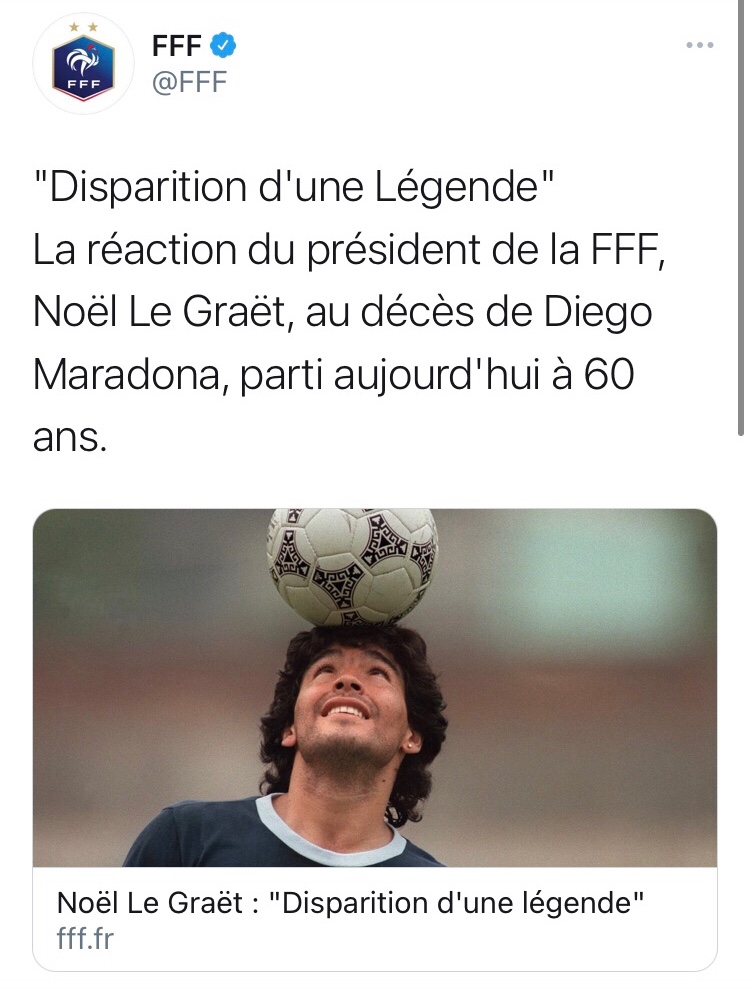 La fédération argentine ainsi que la fédération française ont elles aussi réagi à cette disparition inattendue. Les deux ont souligné que Maradona était éternel et qu’il restera gravé à jamais dans l’histoire du football.