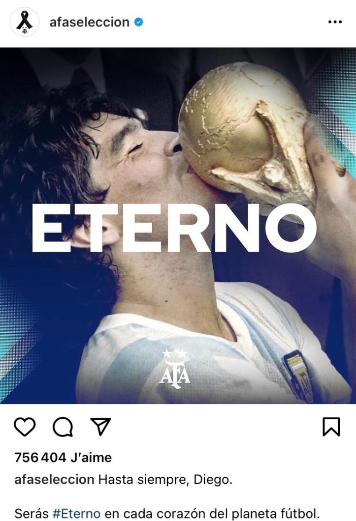 Leo Messi s’est exprimé en postant un post Instagram où il figure avec Maradona en légendant la photo « un jour triste pour tout les argentins et pour le football. Nous ne nous posons même plus la question de pourquoi Diego est éternel ».
